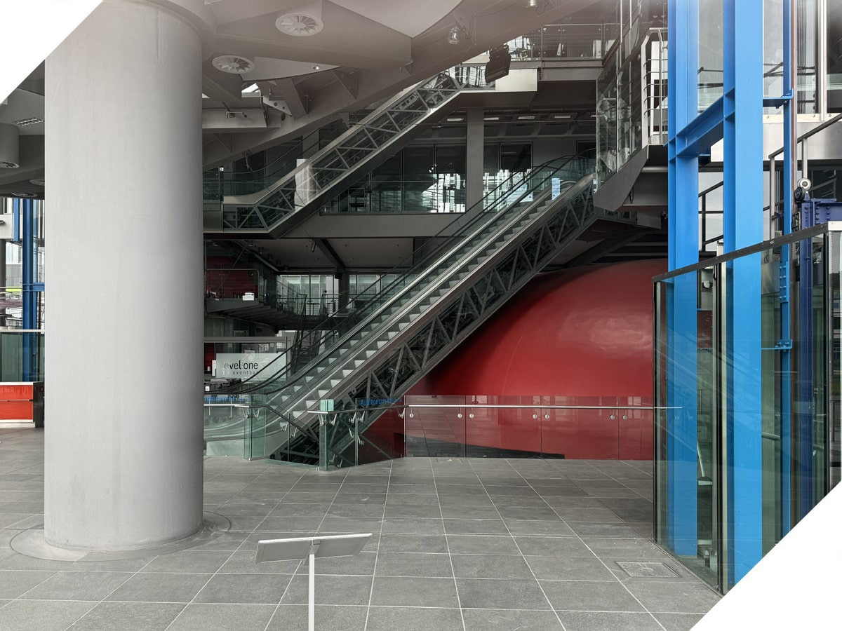 The Academy of Print Media had 26 seminar rooms and an auditorium for 200 people, which could be rented for events and congresses. On floors 6 to 10 were offices. The last floor, the 12th floor, was home to the Schwarz restaurant from 2003 to 2014. After that, ‘Level 12’, an event space, was added there. As you can see, the old signs are still in place.