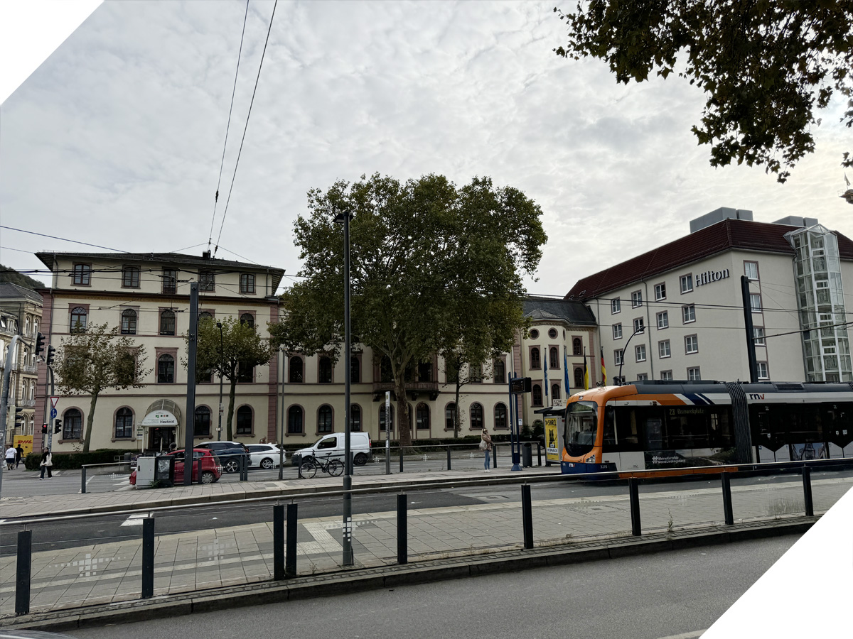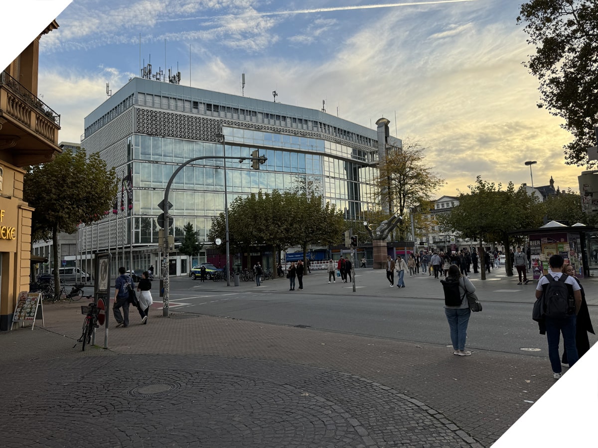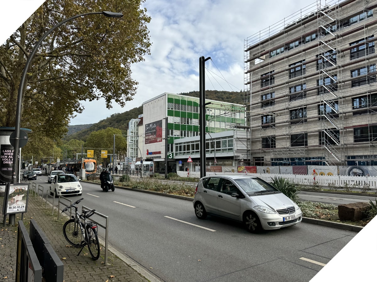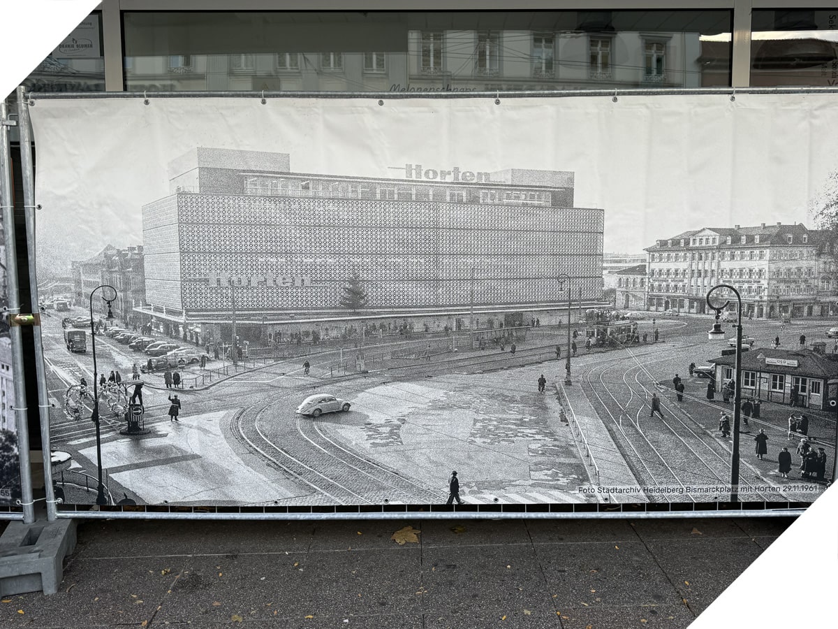 Bismarckplatz, familiar to anyone who has walked along the city’s longest street, Hauptstrasse. Unfortunately, the seven-storey department store Galeria Kaufhof on the square has been closed for many years. Apparently, its fate is still undecided, as well as what to do with the Heidelberger Druckmaschinen headquarters building. But you can find interesting photos on the fence erected around it. It turns out that the building was built in the late 50s as a Horten department store. Then it housed the Karstadt shop for a while, and then the well known Galeria Kaufhof opened.