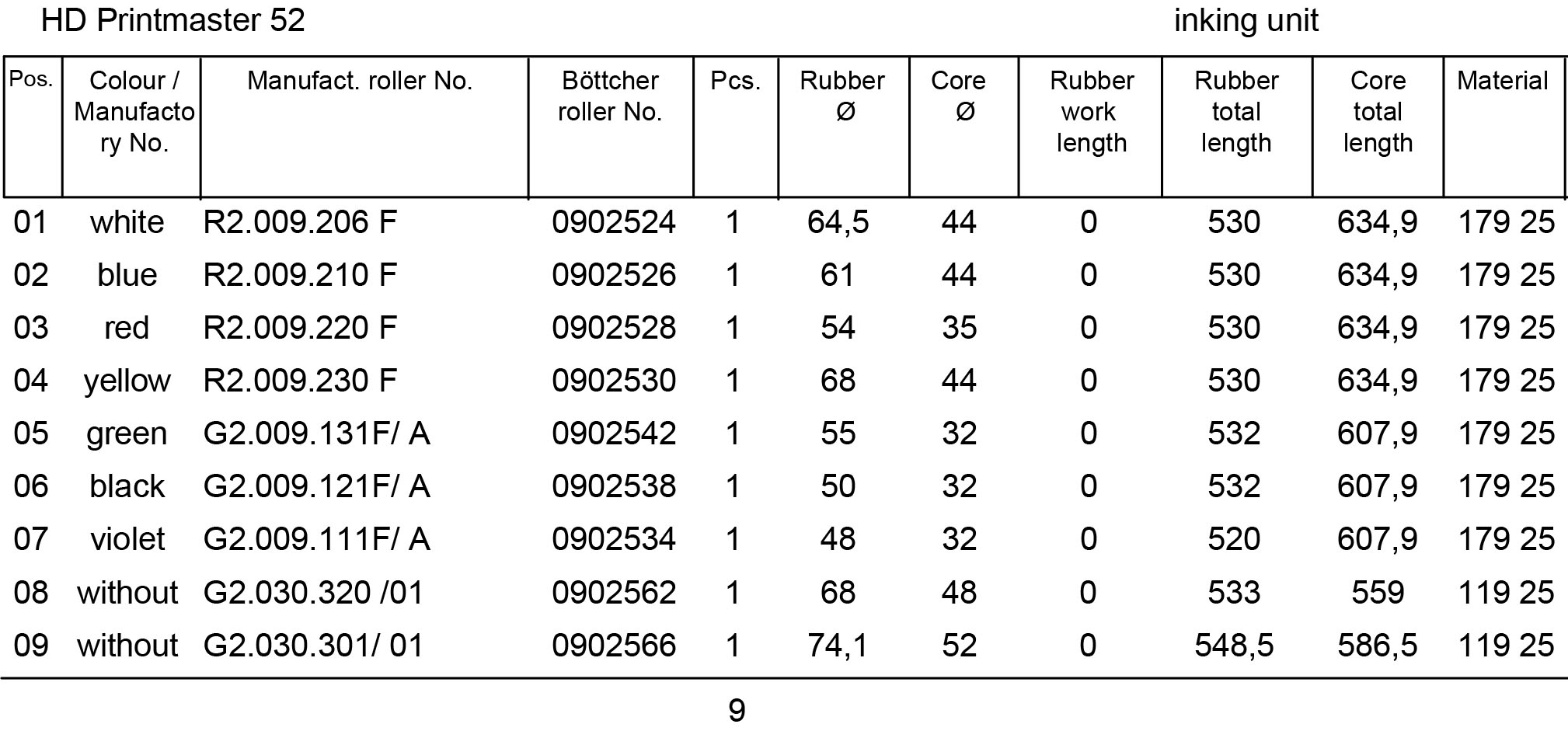 Set of new Boettcher rollers for one printing unit. The price is indicated in euros excluding VAT and without taking into account the return of old rollers.