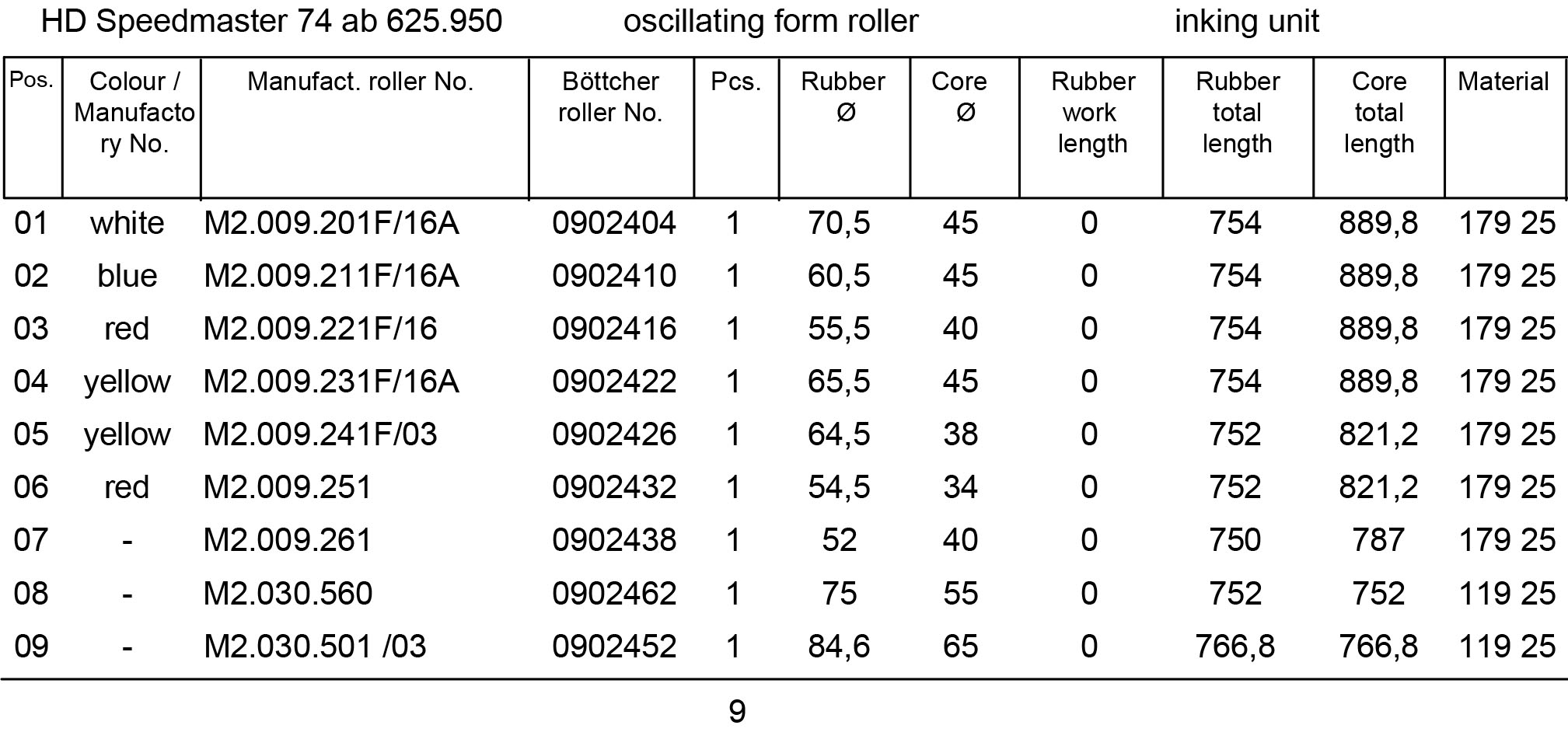 Set of new Boettcher rollers for one printing unit. The price is indicated in euros excluding VAT and without taking into account the return of old rollers.