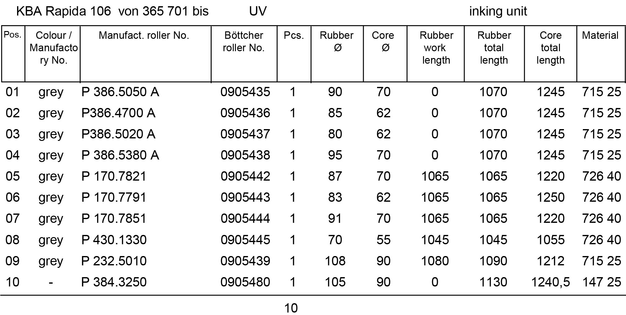 Set of new Boettcher rollers for one printing unit. The price is indicated in euros excluding VAT and without taking into account the return of old rollers.